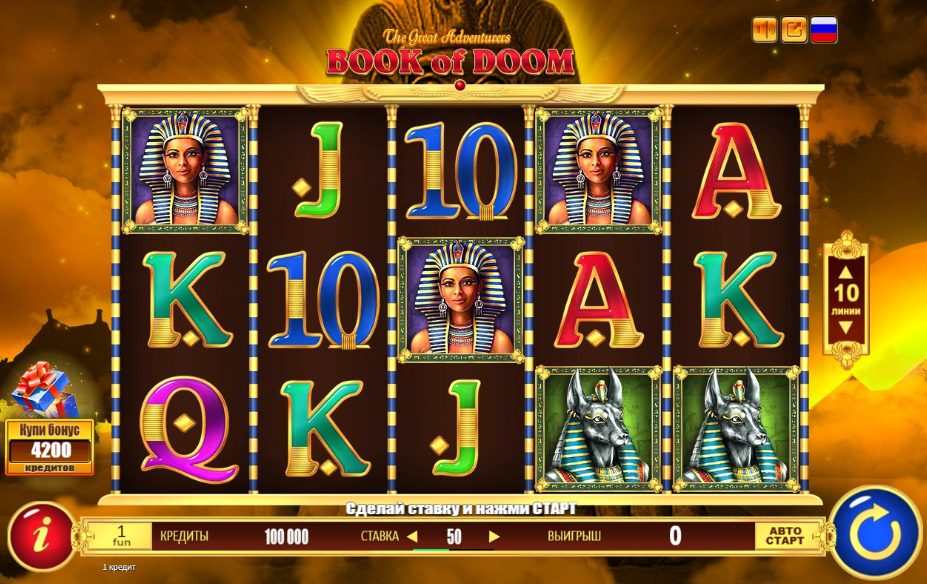 Book of Doom is a slot game with 5 reels and 10 paylines. The goal is to land winning combinations of symbols on the reels to receive payouts. The Book symbol acts as both a wild and a scatter symbol, triggering free spins and bonus rounds.